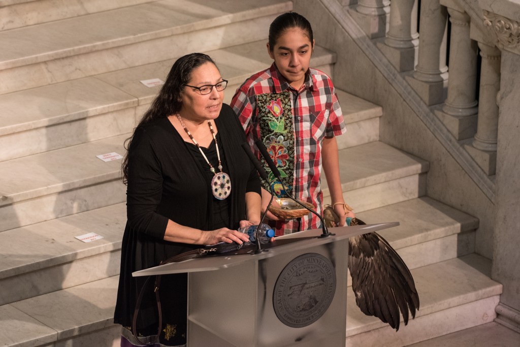 Minnesota has always been a Native place. The state takes its name from a Dakota phrase, Mni Sota Makoce, which translates to “land where the waters reflect the clouds.” While the state’s capital is the other Twin City (St. Paul), Minneapolis is the largest city in the state. Its English name also draws on the Dakota word for water, mni. When added to the Greek word for city, “polis,” the city became Minneapolis. The city’s Dakota name is Bdeóta Othúŋwe, Many Lakes City. For the Ojibwe, it’s known as Gakaabikaang, At the Waterfalls.[1] The city is known for a number of things: it’s the setting of The Mary Tyler Moore Show; it’s home to the state’s professional football, baseball, and men’s and women’s basketball teams; and it’s where Prince was born and honed his musical career.