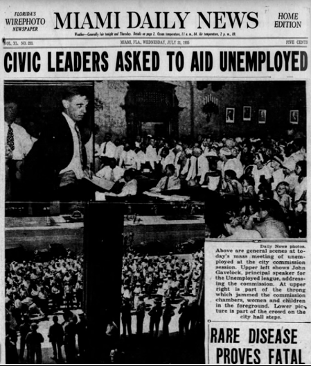 Also forgotten is the city’s unemployment movement. It’s a subject I cover extensively. Suffice it to say that one of the largest social movement demonstrations in Miami’s history occurred in 1935, after years of unemployed and employed worker activism. On July 31, over 1,500 white and Black residents descended upon City Hall asking for assistance. Such figures as Perrine Palmer Sr., the father of the future mayor of the city, helped lead the movement and informed the public of the plight of white and Black worker-residents enduring impoverishment and facing such conditions as poor housing, inadequate health care, and starvation. Seldom ever discussed was the use of tents for housing at various moments in the city’s and region’s history (1924-1926, 1934-1935) or the practice of workers supplementing their food supply by fishing the South Florida waters and tending personal gardens where they harvested vegetables and fruit.