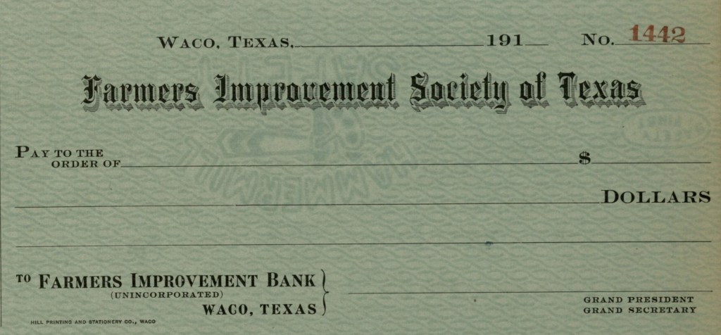 Featured image (at top): The by-laws of the Farmers Improvement Society offered a path to emancipation from credit through a sequential process up a platform to “industrial and economic freedom.” FIS logo, 1925, Texas Collection, Baylor University.