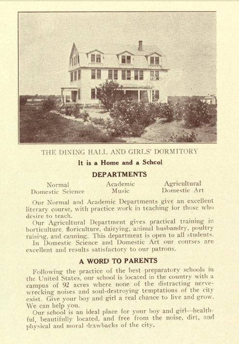 The FIS College was funded privately through donations, mostly from Black families in Texas. It offered high school preparatory classes aimed at assisting young men and women to pursue teaching or a prosperous family farming life. The School’s proclaimed objective was to “train for leadership in rural life.” The curriculum was taught through six departments offering courses in literature, composition, Latin, algebra, history, science, domestic arts, and practical agricultural education covering horticulture, floriculture, animal husbandry, poultry raising, and canning. All students and faculty divided their time between academic instruction and practicums in cultivating peach and pecan orchards, corn, oats, and vegetables, that reinforced practical life lessons for living in the country. Smith regularly taught there when he was not traveling to FIS encampments and convocations. The College closed in 1947.[8]
