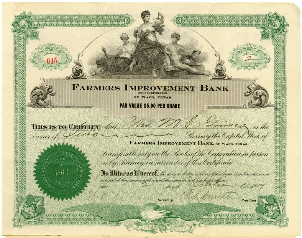 In 1907 the FIS purchased a two-story building at 109 Bridge Street, in the Black business district of Waco, Texas. One year later Smith opened the Farmers Improvement Society Bank. The primary purpose of the bank was to provide low interest loans to FIS members, but it also functioned as the organization’s headquarters. Smith and others managed the Society’s property, policies, and finances. Later, a print shop was opened to produce the society’s newspaper, The Helping Hand (1918-1935). Smith ultimately wanted this bank to not only support FIS credit but also promote the formation and support of other farmers business associations. The bank failed in September 1930, unable to make it through the 1929 U.S. stock market crash.[9]