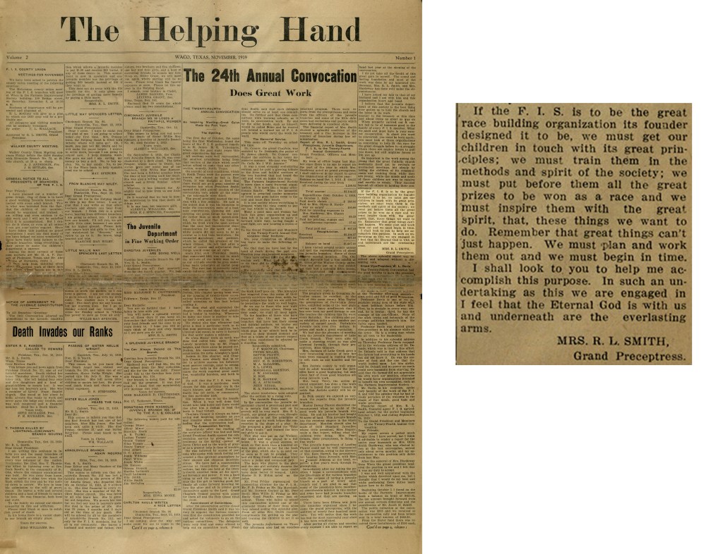 Smith saw value in community connection, in the sharing of knowledge, resources, and support through regular and frequent reminders of an organization’s presence and faith in their membership. In 1897, Smith and some other leadership in the Black business district of Waco started The Helping Hand. Branches announced news of their members, community successes and losses. R.L. Smith and others, including his wife, Ruby Smith, wrote pieces about the organization, benefits of membership, as well as inspirational essays and educational materials on farming. Here, Mrs. Smith discusses a Juvenile branch of the FIS that she started 1919. The Helping Hand ran until 1935.
