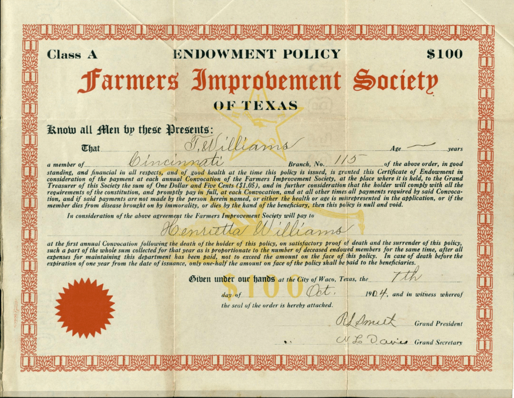 The following photo essay pulls together a series of documents from the Texas Collection, which houses the archives of the Farmers Improvement Society and the Smith family. Each image offers readers engagement with the work of the society beyond numbers, adding richness to the society’s story. They are material culture relics, pieces of the society as it lived in the everyday lives of its members.
