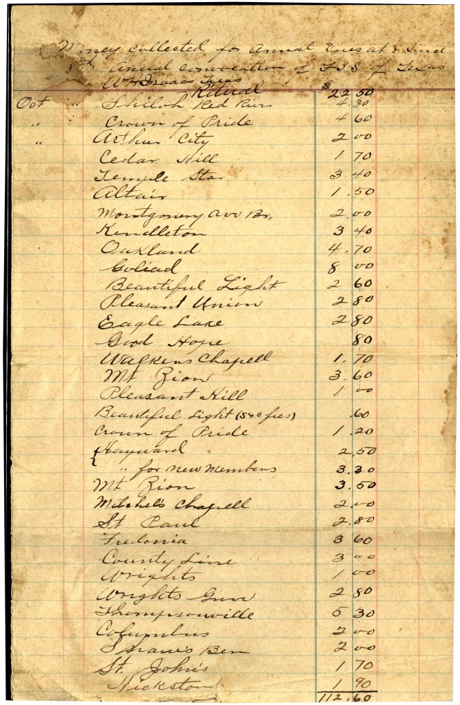 Members paid ten cents annually to belong to the Society. Depending on the size of the family and how many contributing earners a household had, membership could be held by one or more adult family members, usually the same individuals that held sickness and death insurance. Children were not members outside of a later-formed juvenile branch. Any Black community could form an FIS branch with a minimum of ten members. The branches listed are the names of villages, crossroads, and segregated neighborhoods of larger towns scattered mostly throughout East Texas.[5]