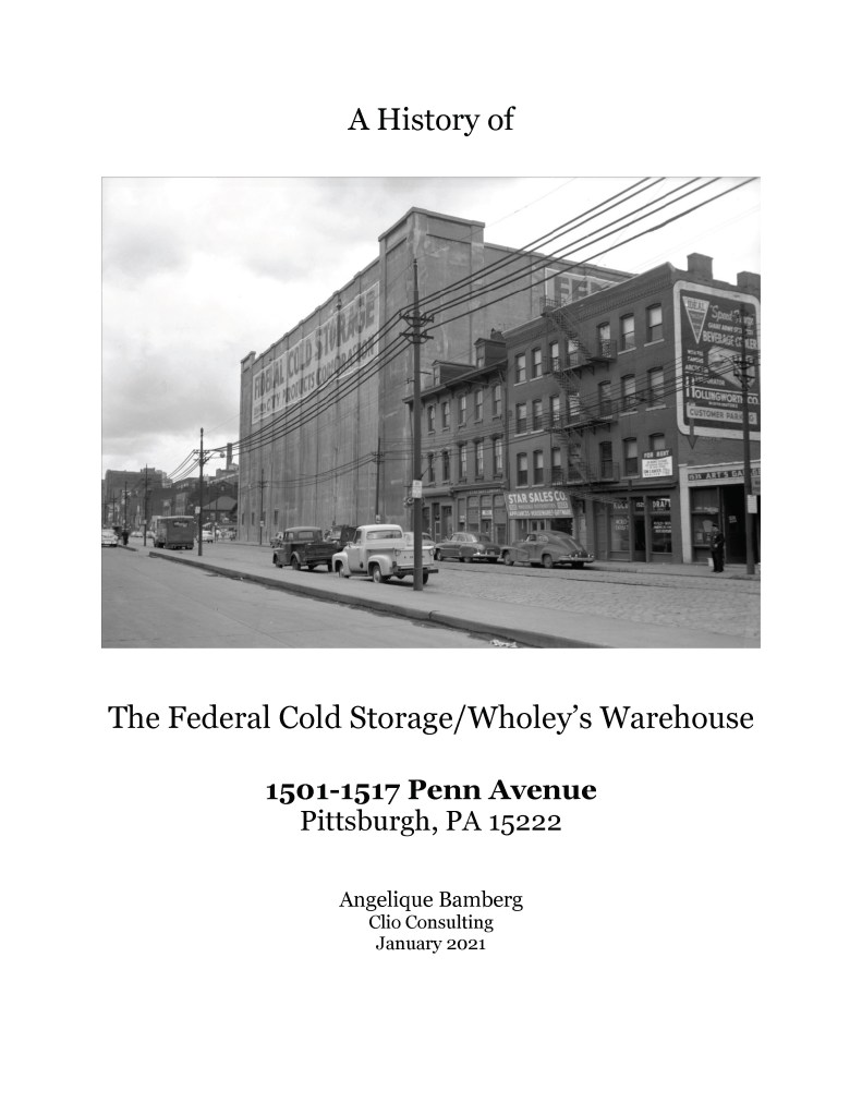 The consultant did not cite any historic newspaper, magazine, or trade journal coverage documenting the building’s history or the people who owned it, worked there, and did business inside its thick walls. In fact, despite copious information available in government databases and digital newspaper archives, the consultant was unable to connect the Pittsburgh building to its counterparts and corporate kin in other cities: “Deeds of transfer of the Federal Cold Storage Warehouse on Penn Avenue describe Federal Cold Storage as a Pennsylvania company based in Pittsburgh. It is not clear whether there is a relationship among these Federal Cold Storage warehouses or if the same name is a coincidence.”[18]