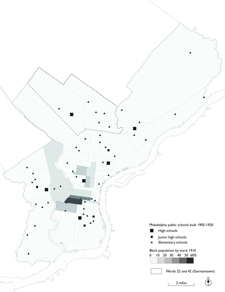 Philadelphia Public Schools Built 1905–1920 and Percentage of Black Residents by Ward, 1920. United States Census, 1920; “Locations and Cost of Buildings and Sites Owned and Rented,” in ARBPE-P, 1920.