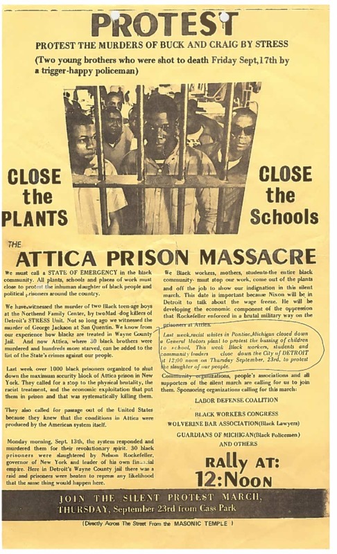 STRESS’s violent and constitutionally dubious assault against Black Detroiters led to the development of a “united front” of Black Power and civil rights organizations calling for the abolition of STRESS. One of Detroit Under Fire’s key contributions is mapping the creation and development of the anti-STRESS State of Emergency Committee. Formed after LDC radical attorneys Kenneth Cockrel and Justin Ravitz brought together 75 African American community leaders around the effort to abolish STRESS, the State of Emergency Committee served as a unity coalition that included civil rights and liberal organizations, white radicals, labor unions, and Black nationalists. At one point, the State of Emergency Committee mobilized 5,000 people, mainly young Black people, to take the streets in protest against STRESS. Readers can view the State of Emergency Committee protest flyer, which linked the 1971 murders of two Black men, Ricardo Buck and Craig Mitchell, by the STRESS unit to the racialized state violence on display at the the Attica prison massacre and the shut down of General Motors in Pontiac by white workers to protest bussing. “We Black workers, mothers, students—the entire black community—must stop our work, come out of the plants and off the job, to show our indignation in this silent march,” the flyer reads.