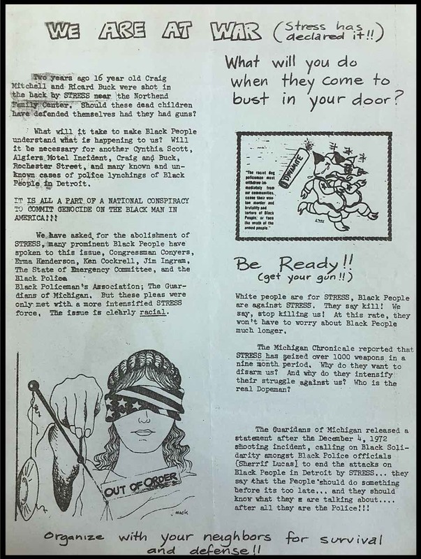It’s difficult to capture all of Detroit Under Fire’s offerings, and we encourage readers of The Metropole to peruse and utilize the entire exhibit, which is laden with political analysis and pedagogical tools. For now, however, we will spotlight Section V: STRESS and Radical Response, 1971-1973, which offers a particularly instructive module for grasping the DPD’s history of racial violence against Black Detroiters, their extensive efforts to cover it up, and Black Detroit’s community organizing against the department’s racist approach to policing street crime.