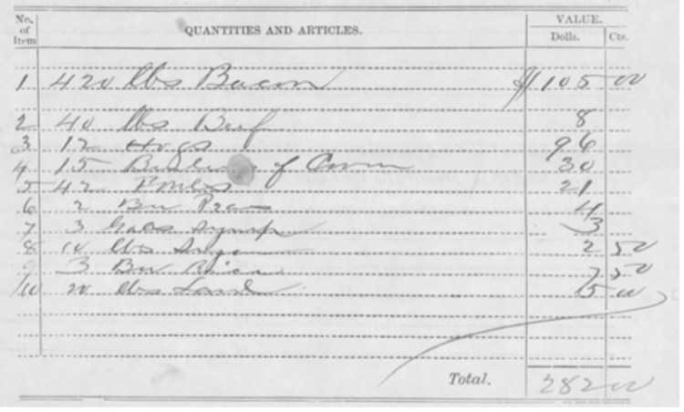 Take out my bacon, smoked beef, fifteen bushels of corn, forty towels, one bushel of peas, three gallons of syrup, four [illegible] of sugar, one and a half [illegible] rice, and one pack of lard. They also took my clothes, blankets, and bedding pots, and pans, and other household articles. They cleaned me out entirely.[ii]