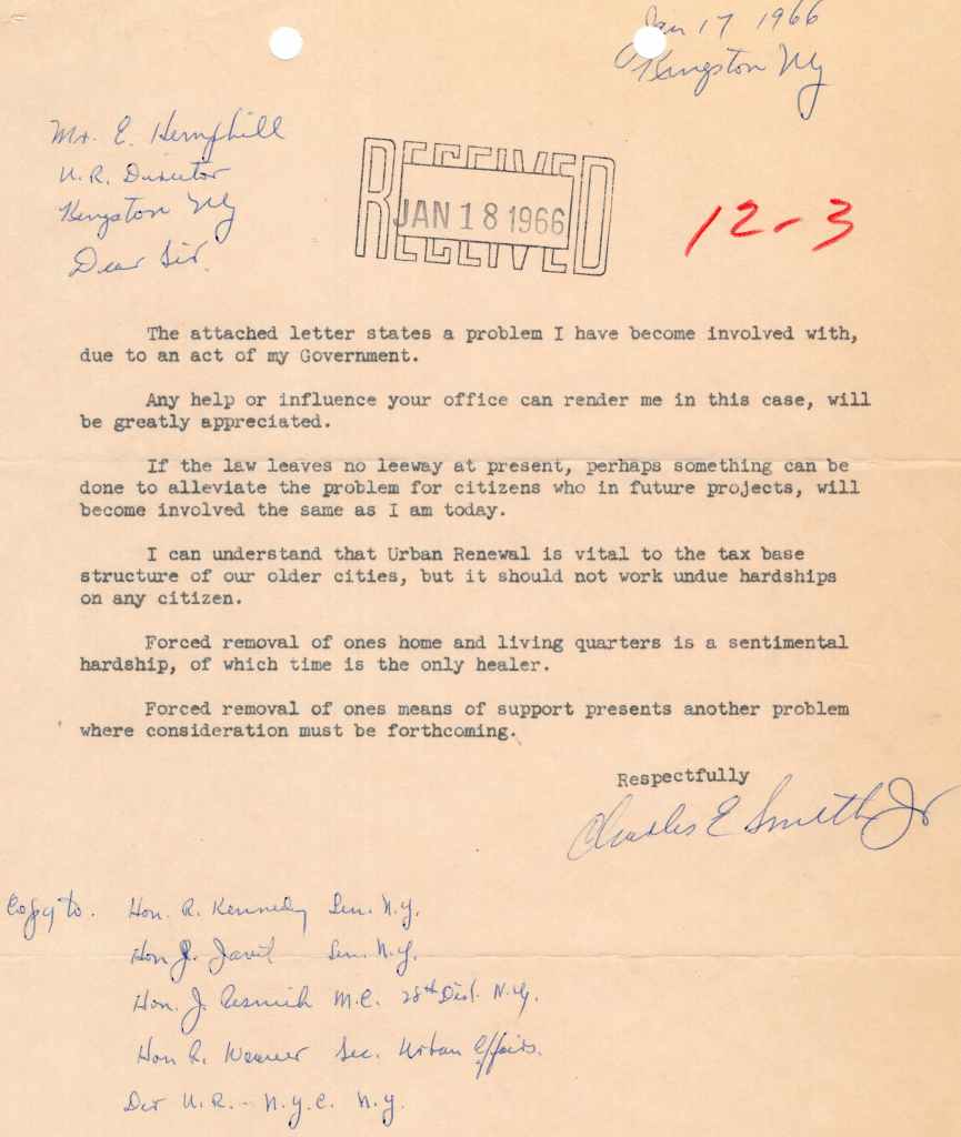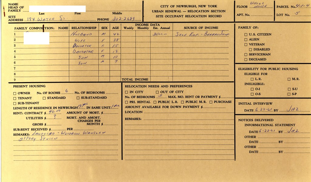 The main challenge we’ve faced is how to develop a narrative strategy that integrates different types of sources: planning maps and photographs, archival documents, and personal recollections. This is something that historians (digital or not) in general face, so we’re not unique here. More specific to our project is the unevenness of the available archival collections, particularly when it comes to images. In the case of Albany, for example, we found several hundred compelling photographs of building interiors and the people inside them, but we’ve been unable to locate residential relocation files that could tell us more about the 7,000 people displaced. In contrast, Kingston appraisal photographs preserve only building exteriors, but the relevant acquisition and relocation records are rich. They contain detailed information about displaced residents and a series of “hardship letters” addressed by property owners to local officials.