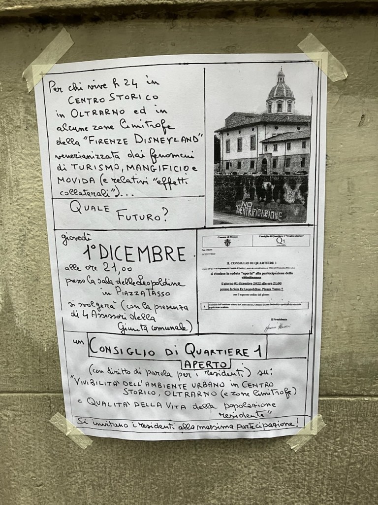 On my way to the Netherlands Interuniversity Institute for Art History (NIKI) in Florence, I saw a poster on the light-yellow stone wall of a house in the Via Romana. The poster calls for the inhabitants of “Firenze Disneyland” to attend a meeting to discuss the future of the city, which is increasingly being flooded with tourists. How can the quality of life for residents be sustained with the continuing growth of the leisure industry? “No gentrification” says the graffiti on the photograph that is included on the poster.