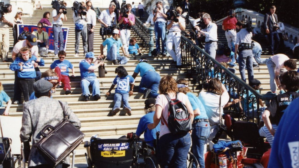 On March 12, 1990, a group of disabled activists gathered to demand the passage of the ADA without weakening it. At the Capitol building, protesters got out of their wheelchairs and crawled up the steps. The dramatic demonstration affected public opinion, and on July 26th, the ADA was passed and signed into law by President George H. W. Bush.