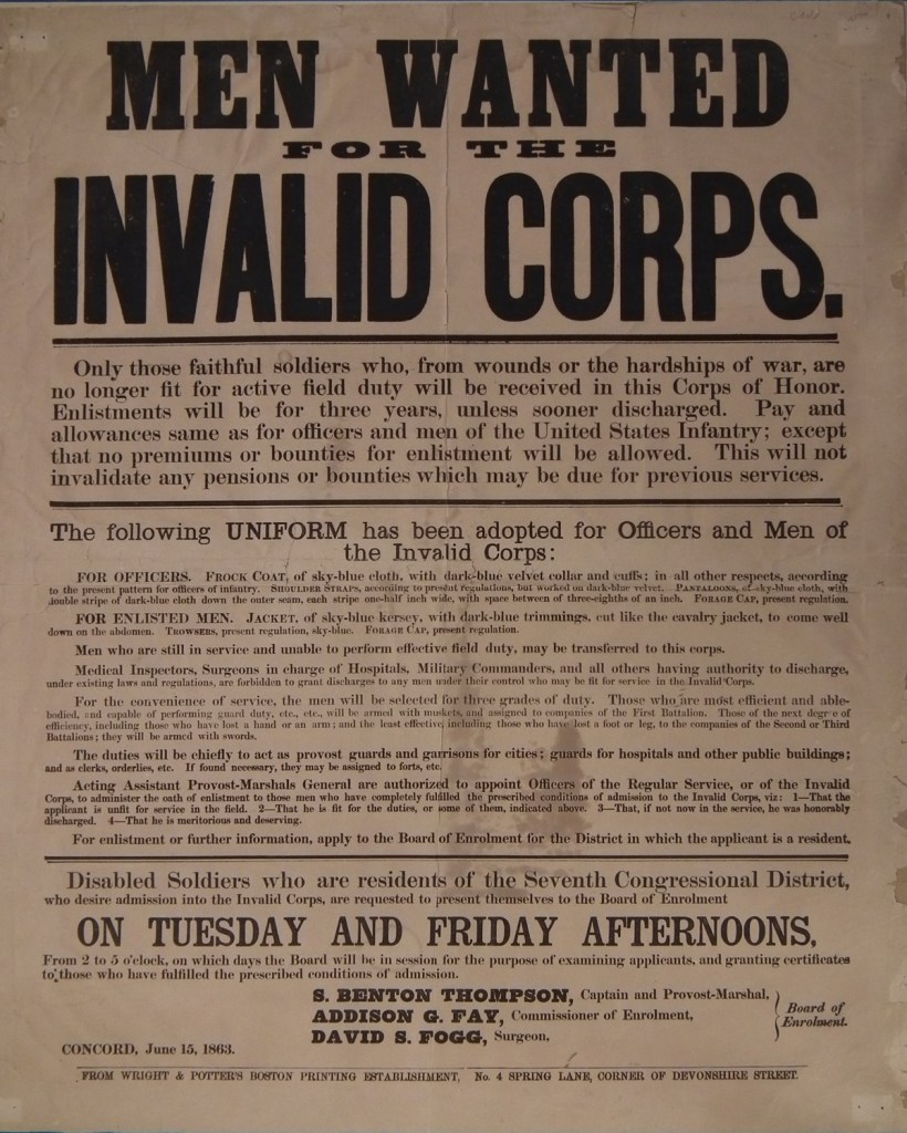 During the Civil War, when the Union was having trouble recruiting enough troops, the Secretary of War authorized what they called the Invalid Corps. Sixty thousand men who had become disabled from the war served in the Corps to free up able-bodied soldiers for the front lines. They guarded prisoners or worked as cooks or nurses.