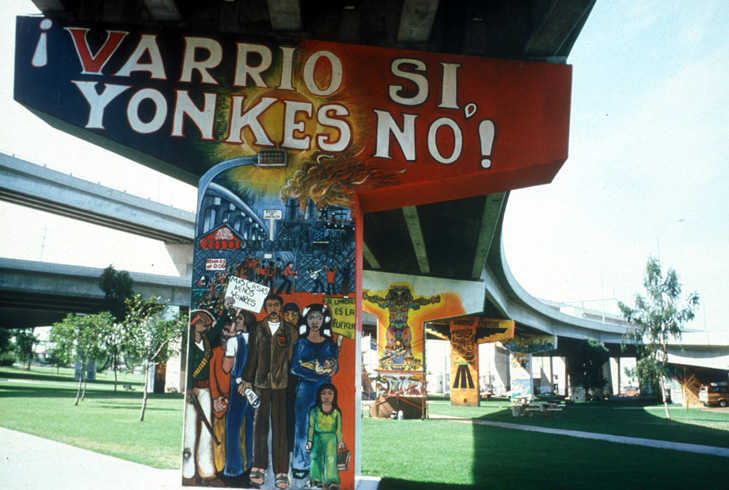 One emblematic protest erupted on Earth Day 1970, when Chicano activists seized land beneath the newly constructed Coronado Bay Bridge in Barrio Logan. Home movie footage shows residents with picks and shovels turning the land into a self-declared “Chicano Park.”[10] Artists famously appropriated the towering bridge supports, creating one of the largest collections of community murals in the world. Through the 1970s, the park evolved as a space for neighborhood celebrations and protest, including efforts to expand the park “All the Way to the Bay” and shut down polluting businesses. Several dozen junkyards—or “Yonkes”—that operated cheek by jowl with local homes were a point of particular contention.