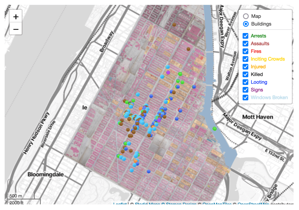 The wealth of information available for 1935 Harlem was generated in response to the racial disorder in the neighborhood on March 19 and 20. Both as the first large-scale racial violence in the United States in more than a decade and the first occurrence in the nation’s most prominent Black neighborhood, the evening of violence had provoked investigations seeking to illuminate the rapidly declining conditions in Harlem and prompt government action. Our plan was to map events and places we found to construct a granular spatial context that would provide a fuller view of what changed in the neighborhood in the 1930s. Initially, we adopted the traditional narrative regarding the nature of the disorder itself. We had accepted the prevailing view that it was characterized not by clashes between Black residents and whites but by attacks on property that prefigured a new form of racial violence. However, when we found prosecutions resulting from the disorder in the DA’s files, the evidence did not support that argument, and my focus shifted toward the events themselves.