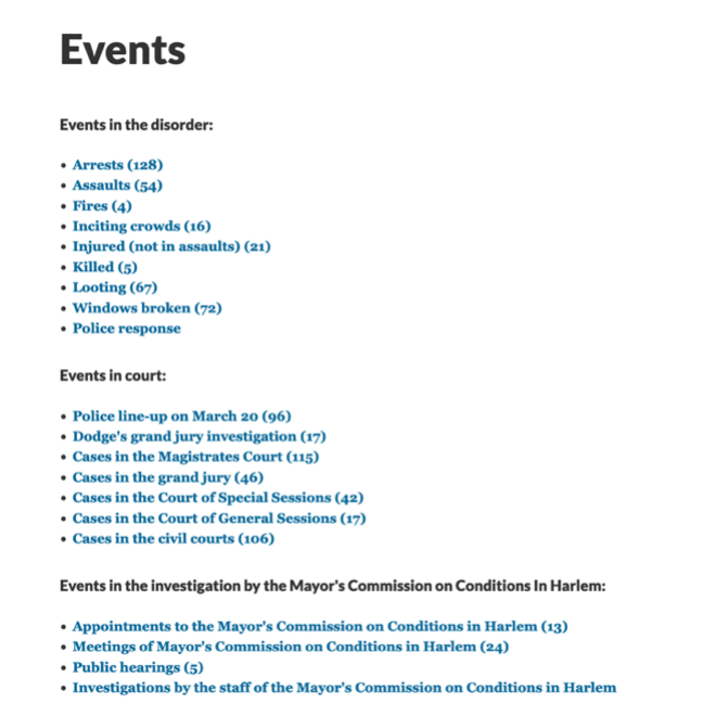 Building on Robert Darnton’s vision of a book structured in “layers arranged like a pyramid,” Harlem in Disorder is a multilayered, hyperlinked narrative. The top layer is a chronological narrative that traces the events of the night of March 19, 1935, hour by hour, the prosecutions that spanned the following several months, and the investigation undertaken by the MCCH that culminated in a report submitted to New York City’s mayor more than a year later. Linked to that narrative is a layer of pages on the individual events of the disorder, in the legal process and in the investigation, which are linked to an additional layer of pages that examine categories and subcategories of events, stages and outcomes in the legal process.
