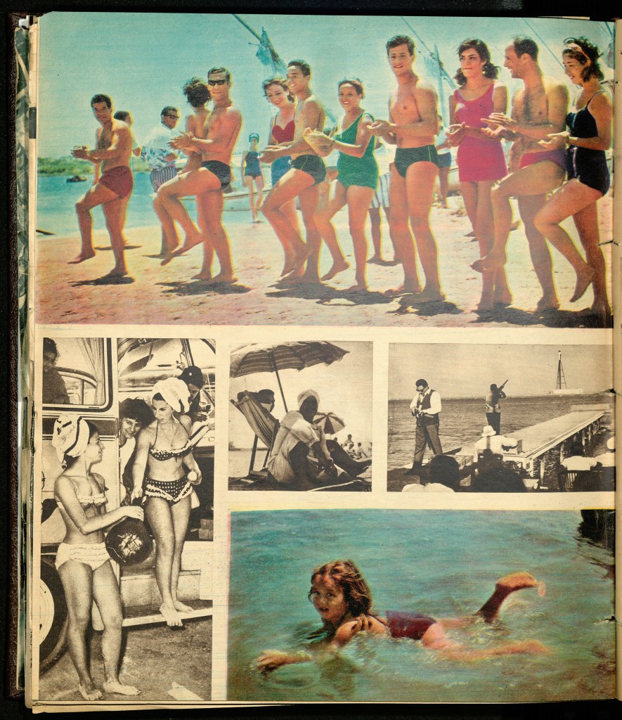 Film stars also contributed to beach culture off the screen. In 1958 movie star, screenwriter, and producer Faten Hamama wrote an essay in al-Kawakib about summering in various locations in Egypt (Figure 9). Alexandria’s beaches are lovely, except for the tendency of men to openly stare at any woman along the shore at Anfushi, the oldest part of the city, situated on the peninsula. “Not one of these young men hesitates to stare at whatever beauty they are tempted by.”[23] Her favorite summer spot, however, is at Ra’s al-Bar in Dumyat. This less crowded destination provides a quiet day among ordinary people—nothing offered but what is needed. Hamama demonstrates that the beach, at the edge of the city, was central to conversations about women’s role in post-war Egypt. The images of young women having fun in magazines, candid or staged, were curated and selective. Experiences in real life varied, and women’s bodily autonomy and right to be left alone was unassured.[24]