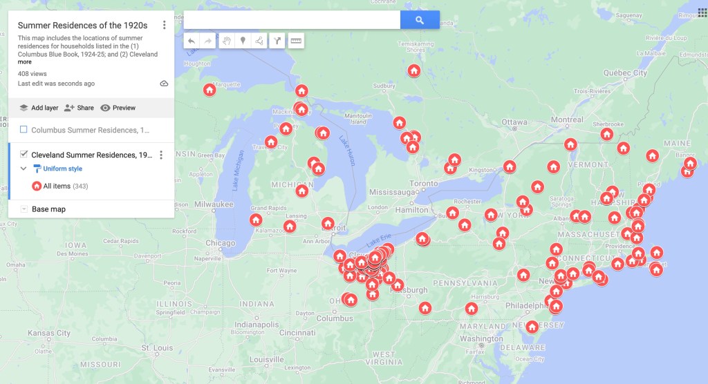 As two illustrative examples of upper class summering behavior, I have recorded the 340 summer residence locations of the Blue Book households for Cleveland and the 44 summer residences in the Columbus edition. With a population of 796,841 in 1920, Cleveland ranked as the fifth most populous city in the nation. At the same time, Columbus had just 237,031 people. As such, the number of summer residences—as well as the total number of households listed in the directory—was much smaller for Columbus.