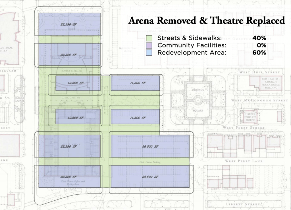 Sottile Option 2: Arena Removed and Theatre Replaced. “Savannah Civic Legacy; Planning for the Civic Center & Restoration of Elbert & Jackson Wards,” prepared for City Council Meeting, May 23, 2024. Courtesy of the City of Savannah.