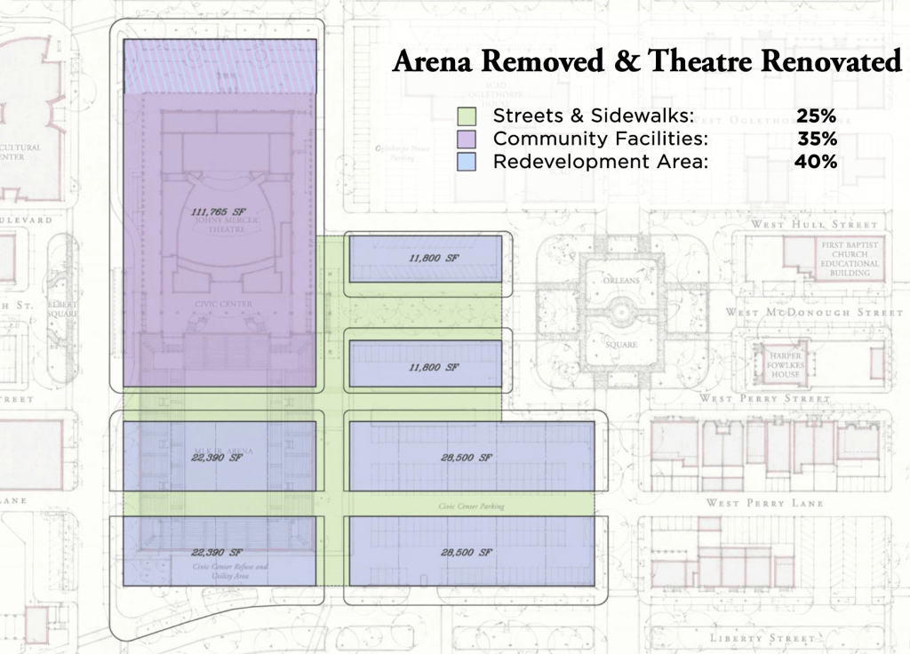 Sottile Option 3: Arena Removed and Theatre Renovated. “Savannah Civic Legacy; Planning for the Civic Center & Restoration of Elbert & Jackson Wards,” prepared for City Council Meeting, May 23, 2024. Courtesy of the City of Savannah.