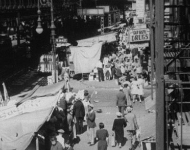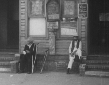 So, too, is there an incongruity between narrative and visual in how Lewis addresses the aftermath of the March 1935 unrest. In the section of the film dedicated to 125th Street as a business district, the film’s narration states that “it provides the ordinary necessities of life, giving in exchange some employment.” The following shots clash with his words: a blind man begs for money on the street; one storefront’s windows are fully plastered with signs signaling its demise, reading “IT’S THE END” and “LOST LEASE MUST VACATE.” When he more directly addresses the Depression, Lewis only hints at the violence just a few years before and its impact on Harlem.