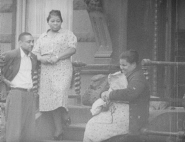 Life in Harlem itself displays tensions in how it tells Harlem’s story. At the height of the Great Depression, nearly half of the city’s Black population received some form of public assistance, and forty percent of Black men were unemployed.[8] Yet, even as Lewis’s narration speaks to these issues in Harlem, his visuals refuse to adopt a negative lens. For example, audiences hear about Harlem’s high unemployment rates across two shots: one of a young man and two women having a conversation and another in which an older woman holds a baby. In the former, one of the women laughs, presumably at something said, the other offers a coy smile and inaudible reply. In the second shot, the grandmother bounces the baby on her lap with an animated smile, seemingly enjoying herself. Later in the film, a shot centers two men resting between a sign that reads “positively no loafing.” One man reclines, his foot resting on the steps, the other simply eats his lunch, neither looks particularly bothered. Each of these moments—seemingly random street scenes of the neighborhood—evoke moments of resilience or defiance in the midst of financial crisis.[9] Rather than frame Harlem’s economic realities as tragedy or bleak, Lewis works to find joy, life, and friendship in the city.
