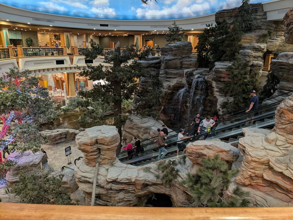In the decade since that interview, the region has only cemented its place as the “Waterpark Capital of the World.” Adding more resorts and slides each year, the Dells tourism economy nearly doubled to an estimated $2.05 billion in 2014, drawing over 5 million annual visitors. The Dells now boasts the highest waterparks per capita and holds records for the largest outdoor, indoor, and indoor-outdoor waterparks.[2] For many of today’s visitors, their closest glimpse of the natural rock formations might be the man-made replica in the Ho-Chunk Casino and Convention Center, an immersive lobby exhibit with cement cliffs, plastic ferns, illuminated waterfalls, and wire-strung birds, its terrain carved through the middle by a giant escalator.