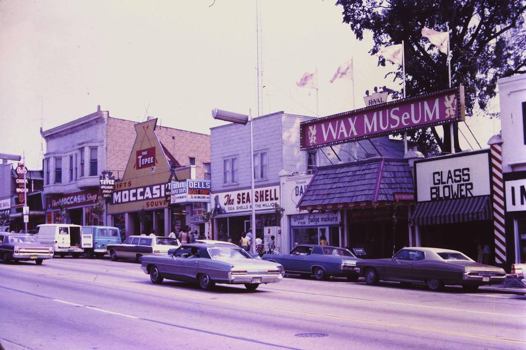 As cars became affordable to middle-class families, the Dells evolved from a railroad destination requiring multi-day stays into a weekend getaway. New businesses gravitated towards the US 12 highway between the downtown Wisconsin Dells and Lake Delton. Along both commercial strips, a new family-oriented tourism economy proliferated, of go-kart tracks, mini-golf courses, wax museums, haunted houses, and gift shops selling rubber tomahawks and beads.