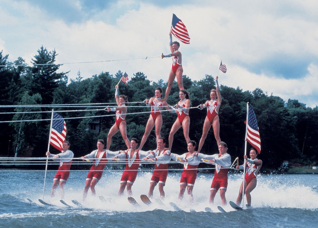 In the 1950s, a burst of roadside attractions along US 12 further shifted the axis of gravity. Storybook Gardens featured whimsical scenes from the likes of Humpty Dumpty to Cinderella, while the Wonder Spot stuffed a playland of optical illusions into an unassuming cabin. Tommy Bartlett, a radio personality from Chicago, established his water ski shows in 1952, which became a signature attraction; set on Lake Delton, they had little to do with the surrounding landscape or history, instead featuring pure spectacle and athletic feats, its performers often wearing patriotic swimsuits or riding NASA space shuttles.