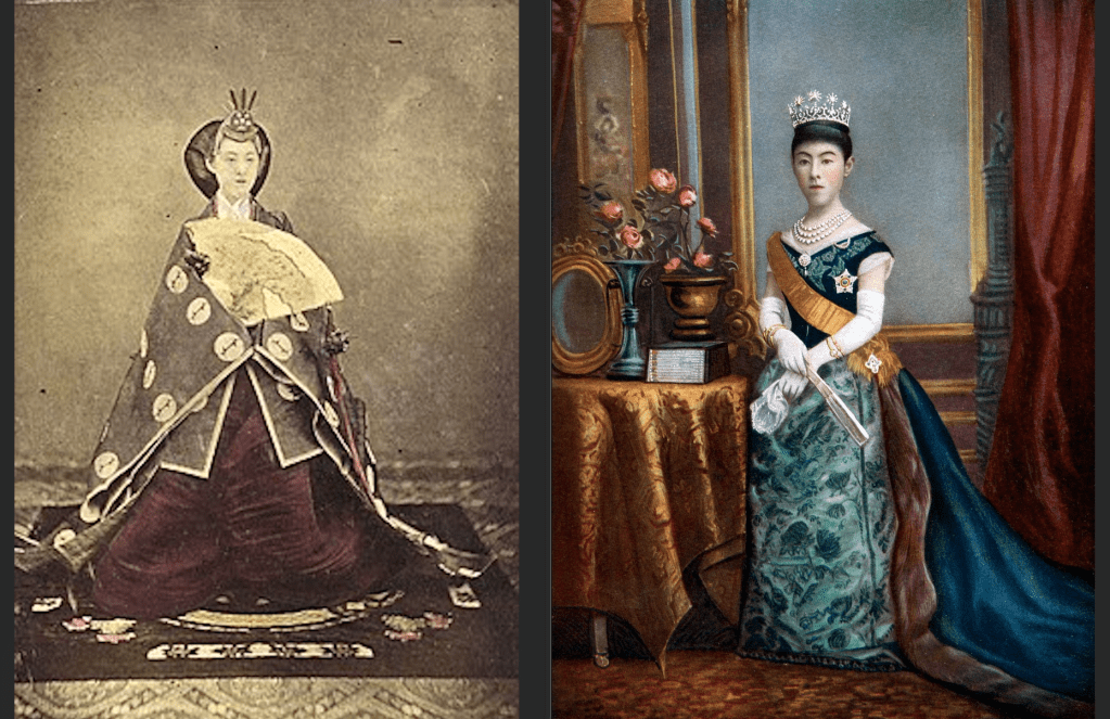 Empress Shōken in traditional court dress (left) and Western gown (right). As the first empress to appear publicly, her strategic fashion choices performed Japan’s modernization—the imperial body as living demonstration of systematic cultural transformation.