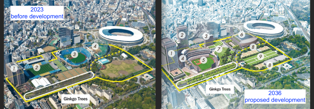 The official project website presents a buoyant narrative, emphasizing that the redevelopment will “carry on the legacy and wishes of our predecessors” with the end result of world-class sports facilities and revamped landscape. It promises to enhance disaster (namely, earthquake damage) prevention, improve accessibility, and “sustainable urban development” with more green space. There is little or no mention of the hundreds of elderly households facing eviction (in some cases, for the second time), the elimination of baseball fields and tennis courts used by ordinary citizens, or the fact that the “green space” consists of luxury hotel rooftop plantings replacing grand old trees at street level. Public outcry, augmented by famous culturists like novelist Murakami Haruki and composer Sakamoto Ryuichi, had gained momentum to the point where the Tokyo governor was nicknamed the “Empress of Tree-Cutting”–but the unpopular redevelopment plan is full steam ahead. Construction began in October 2024, with adjustments to the tree count (by the end of the project, the total number will be even more than what it was pre-redevelopment), a new baseball stadium built farther away from Ginkgo Avenue, new skyscrapers that house commercial and residential activities, as well as renovations to various sports facilities.