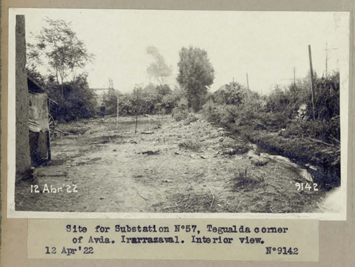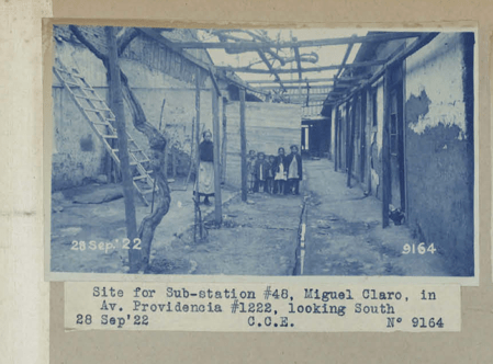 The visual archive shows that the electric company took numerous photographs documenting housing conditions. For example, in the following image of Substation 57’s site in southern Santiago, taken in 1922, we can appreciate the landscape before and after the infrastructure’s construction. The image shows a relatively rural setting, with what appears to be a water canal on our right and the remains of an informal house on our left (Fig. 2).